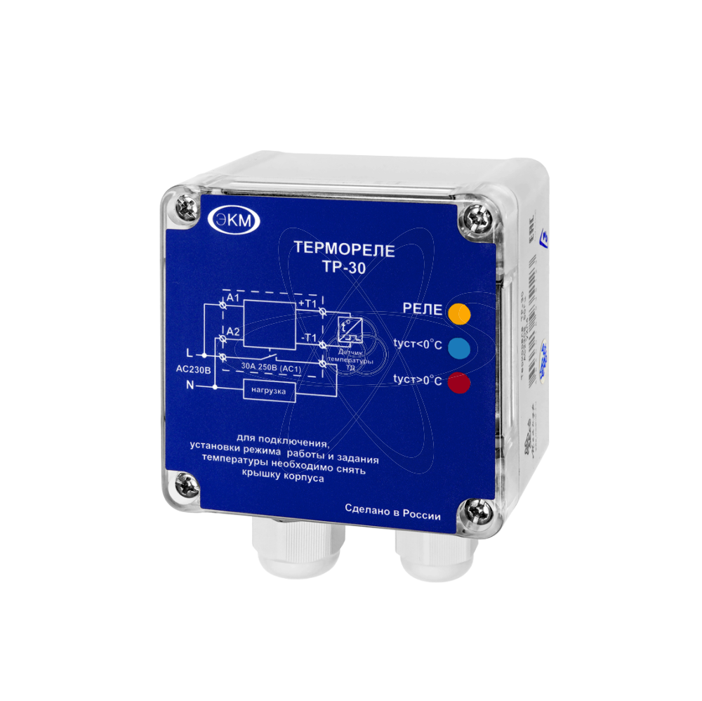 ТР-30  (далее-реле) термореле предназначено для контроля и поддержания заданного температурного режима по сигналу датчика температуры в помещениях,  системах водяного отопления, овощехранилищах,охлаждающих систем, жидкостей, предметов и т. п., а также для использования в качестве комплектующего изделия в устройствах автоматики. Реле выпускается в герметичном пластиковом корпусе. В нижней части корпуса расположены сальники для проводов питания и коммутируемой цепи. Монтаж осуществляется на ровную поверхность или на монтажную панель. Для установки реле, необходимо снять лицевую крышку, через отверстия расположенных по углам корпуса закрепить корпус четырьмя саморезами М4 или винтами . Клемная конструкция питания обеспечивает надёжный зажим проводов сечением до 1,5мм2. Конструкция клемм коммутируемой цепи обеспечивает надёжный зажим проводов сечением до 3,31мм2.  На плате прибора расположены: два декадных переключателя для задания температуры «t0С» (установка значений единиц 0-9 и десятков 0-9), переключатель «+t/∆» для задания положительной или отрицательной температуры, зоны гистерезиса и режима работы (охлаждение-нагрев), красный светодиод «+t» режима нагрева, синий светодиод «-t» режима охлаждения, жёлтый светодиод включения исполнительного реле. Реле может работать в двух режимах: «охлаждение» или «нагрев» .  «Охлаждение» - режим, при котором исполнительное реле включено, если контролируемая температура выше установленной (холодильник).«Нагрев» - режим, при котором исполнительное реле включено, если контролируемая температура ниже установленной (нагреватель). Режим работы выбирается при помощи переключателя «+t/∆» первые пять положений переключателя соответствует режиму охлаждение «Охл», следующие пять положений переключателя режиму нагрев «Нагр». Включение исполнительного реле контролируется жёлтым светодиодом. Когда реле включено, горит жёлтый светодиод и контакты замкнуты. В режиме «нагрев» при включении питания, если температура в контролируемой точке будет ниже установленной, реле включится. По достижении установленной температуры (t0Суст) - реле выключится. При остывании, повторное включение реле произойдёт при температуре t0Суст-∆ (с учётом гистерезиса). В режиме «охлаждение» при включении питания, если температура в контролируемой точке будет выше установленной, реле включится. По достижении установленной температуры реле выключится. При последующем повышении температуры, реле включится при температуре t0Суст+∆ (с учётом гистерезиса).
