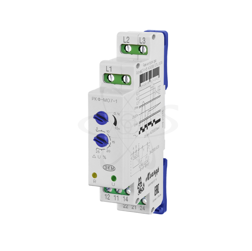 РКФ-М07-1-15 (далее-реле) реле контроля фаз  предназначено для контроля трёхфазного линейного напряжения в трёхпроводных сетях (без нейтрали). Реле контролирует  обрыв и «слипание» фаз,порядок чередования фаз, превышение напряжения выше и снижение напряжения ниже установленного порога. Реле выпускаются в унифицированном пластмассовом корпусе модульного исполнения с передним присоединением проводов питания и коммутируемых электрических цепей. Монтаж осуществляется на  рейку-DIN шириной 35 мм (ГОСТ Р МЭК 60715-2003) или на монтажную панель. Для установки реле на монтажную панель пружины замков необходимо раздвинуть. Клемная конструкция обеспечивает надёжный зажим проводов сечением до 2,5мм2. На передней панели реле расположены: декадный переключатель времени срабатывания, декадный переключатель порога синхронного превышение и снижения  напряжения, зелёный светодиод включения питания «U», жёлтый светодиод срабатывания встроенного исполнительного реле «R». Напряжение фаз А, В, С контролируемой сети подключается соответственно к клеммам L1, L2, L3 . Выходные контакты реле 12-11-14, 22-21-24 подключаются к схеме управления. При подаче на реле трёхфазного напряжения загорается зелёный светодиод «U» и осуществляется проверка всех контролируемых параметров сети. Если все параметры в норме, включается встроенное исполнительное реле, загорается жёлтый светодиод «R», замыкаются контакты 11-14, 21-24 . При возникновении неисправности - на выходе хотя бы одного контролируемого параметра за пределы допустимых величин, реле выключается через время t, установленное пользователем. При возвращении параметров в норму реле включается без задержки. При превышении напряжения выше установленного значения, при нарушении порядка чередования фаз, при пропадании двух или трёх фаз одновременно реле выключится без отсчёта задержки времени срабатывания, установленной пользователем.