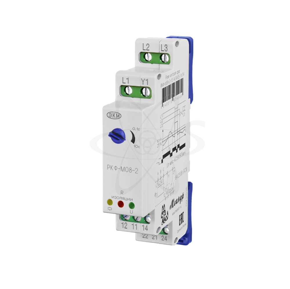 РКФ-М08-1-15 (далее-реле) реле асимметрии фаз с контролем изоляции предназначено для контроля трёхфазного линейного напряжения в трёхпроводных сетях (без нейтрали) с предпусковым контролем сопротивления изоляции обмоток двигателя. Также реле может использоваться в четырёхпроводных сетях (с нейтралью), но при этом функция контроля сопротивления изоляции работать не будет. Реле контролирует обрыв фаз, «слипание» фаз, порядок чередования фаз,снижение ( превышение) напряжения ниже (выше) фиксированного значения. Реле выпускаются в унифицированном пластмассовом корпусе модульного исполнения с передним присоединением проводов питания и коммутируемых электрических цепей. Монтаж осуществляется на рейку-DIN (ГОСТ Р МЭК 60715-2003) или на монтажную панель. Для установки реле на монтажную панель пружины замков необходимо раздвинуть. Клемная конструкцуия обеспечивает надёжный зажим проводов сечением до 2,5мм2. На передней панели прибора расположены:декадный переключатель времени срабатывания, красный светодиод сопротивления изоляции «R изоляции», зелёный светодиод «U» наличия напряжения в трёхфазной сети, жёлтый светодиод «R» включения встроенного исполнительного реле. При использовании реле в трёхпроводных сетях (без нейтрали), фазы А, В, С контролируемой сети подключаются соответственно к клеммам «L1», «L2», «L3». Для осуществления контроля изоляции клемму «Y1» необходимо соединить с одной из фаз после контактов магнитного пускателя (на двигателе). Выходные контакты реле 14-11-12 подключаются к схеме управления работой двигателя. Контроль сопротивления изоляции двигателя относительно земли осуществляется сразу после подачи на реле трёхфазного напряжения, если клемма «Y1» соединена с одной из фаз на двигателе и все параметры сети в норме. В противном случае реле не включится и измерение сопротивление изоляции осуществляться не будет (индикаторы «R» и «R изоляции» выключены). Если контролируемые параметры сети в норме, а сопротивление изоляции обмоток двигателя окажется ≤ 500 кОм, исполнительное реле останется выключенным и будет мигать красный светодиод «R изоляции». Если сопротивление изоляции двигателя >500 кОм, начинается непрерывный анализ всех параметров сети. Когда они остаются в норме, исполнительное реле и жёлтый светодиод «R» включены (замкнуты контакты 11-14 и 21-24). При возникновении неисправности на выходе , хотя бы одного параметра за пределы допустимых величин, исполнительное реле и светодиод «R» выключаются (замыкаются контакты 11-12 и 21-22 ). При обнаружении обратного порядка чередования фаз, при пропадании двух или трёх фаз или при превышении фиксированного порога напряжения - исполнительное реле выключается без отсчёта установленной задержки времени срабатывания. При снижении напряжения ниже фиксированного порога или при обрыве одной фазы, реле выключается через время t, установленное регулятором времени срабатывания на лицевой панели реле. При возвращении параметров в норму, реле включается сразу, без учёта этой задержки. При использовании реле в четырёхпроводных сетях с изолированной нейтралью фазы А, В, С подключается соответственно к клеммам «L1», «L2», «L3» реле, при этом клемма «Y» не задействована и контроль сопротивления изоляции отсутствует.
