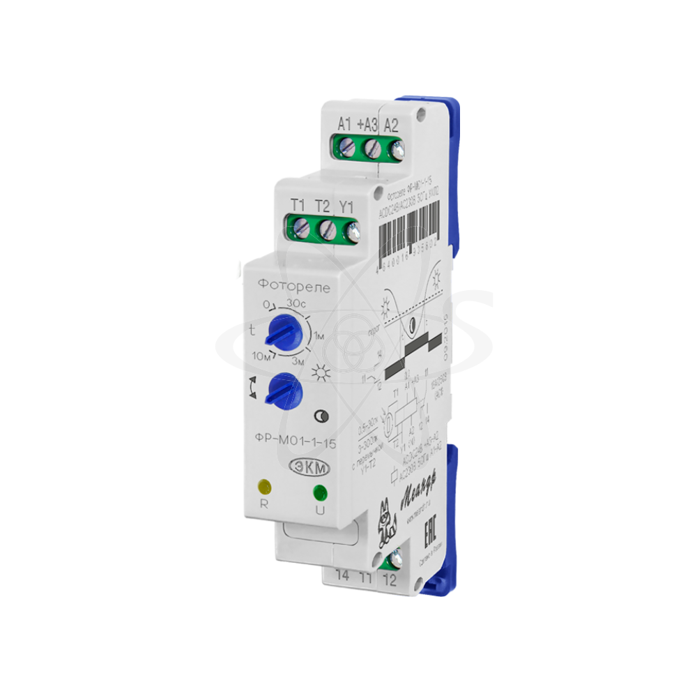 ФР-М01-1-15 (далее-реле) фотореле предназначено для автоматического отключения и включения освещения улиц,торговых залов, витрин магазинов, автостоянок, реклам и т.п. в зависимости от установленного порога уровня освещённости. Контроль уровня освещённости осуществляется при помощи выносного фотодатчика ФД-3-1, поставляемым в зависимости от комплектации (см. код для заказа). Реле выпускаются в унифицированном пластмассовом корпусе модульного исполнения с передним присоединением проводов питания и коммутируемых электрических цепей. Монтаж осуществляется на рейку-DIN шириной 35мм (ГОСТ Р МЭК 60715-2003) или на монтажную панель. Для установки реле на монтажную панель, фиксаторы замков необходимо раздвинуть. Клемная конструкция обеспечивает надёжный зажим проводов сечением до 2,5мм2. На передней панели прибора расположены: декадный переключатель времени срабатывания реле «t», декадный переключатель уровня освещённости, зелёный светодиод включения напряжения питания «U», жёлтый светодиод срабатывания встроенного исполнительного реле «R». При монтаже фотодатчика необходимо исключить попадание света от коммутируемого источника света на фотодатчик и возможность загрязнения окна фотоприёмника.