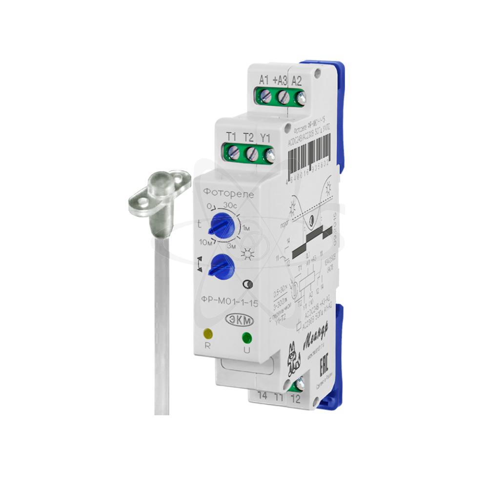ФР-М01-1-15 (далее-реле) фотореле предназначено для автоматического отключения и включения освещения улиц,торговых залов, витрин магазинов, автостоянок, реклам и т.п. в зависимости от установленного порога уровня освещённости. Контроль уровня освещённости осуществляется при помощи выносного фотодатчика ФД-3-1, поставляемым в зависимости от комплектации (см. код для заказа). Реле выпускаются в унифицированном пластмассовом корпусе модульного исполнения с передним присоединением проводов питания и коммутируемых электрических цепей. Монтаж осуществляется на рейку-DIN шириной 35мм (ГОСТ Р МЭК 60715-2003) или на монтажную панель. Для установки реле на монтажную панель, фиксаторы замков необходимо раздвинуть. Клемная конструкция обеспечивает надёжный зажим проводов сечением до 2,5мм2. На передней панели прибора расположены: декадный переключатель времени срабатывания реле «t», декадный переключатель уровня освещённости, зелёный светодиод включения напряжения питания «U», жёлтый светодиод срабатывания встроенного исполнительного реле «R». При монтаже фотодатчика необходимо исключить попадание света от коммутируемого источника света на фотодатчик и возможность загрязнения окна фотоприёмника.