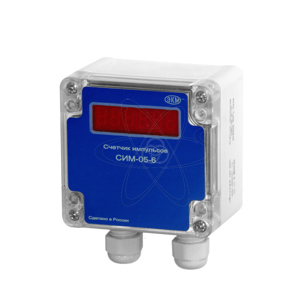 СИМ-05-6 (далее-счетчик) счётчики импульсов предназначены для подсчёта событий (импульсов) от внешних датчиков и отображения текущих значений на цифровом индикаторе. Используется внешняя кнопка "СБРОС", подключаемая к разъёмам датчика.