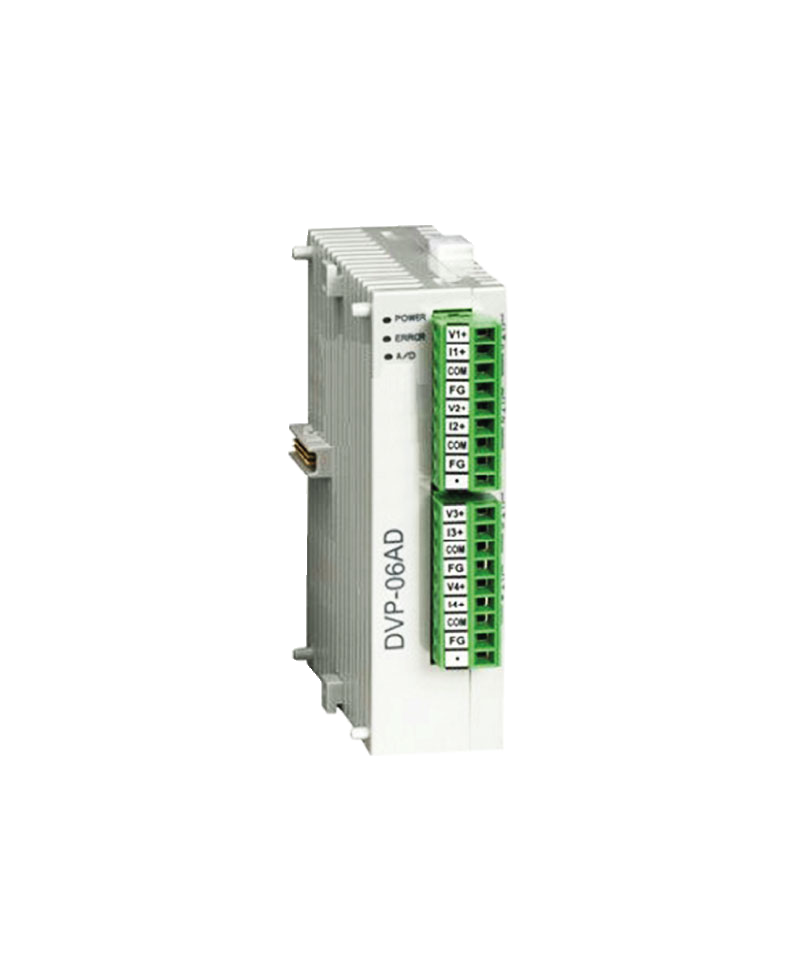 - DVP06AD-S Модуль аналогового ввода: 6AI, 14bit, 24V DC Power, SLIM