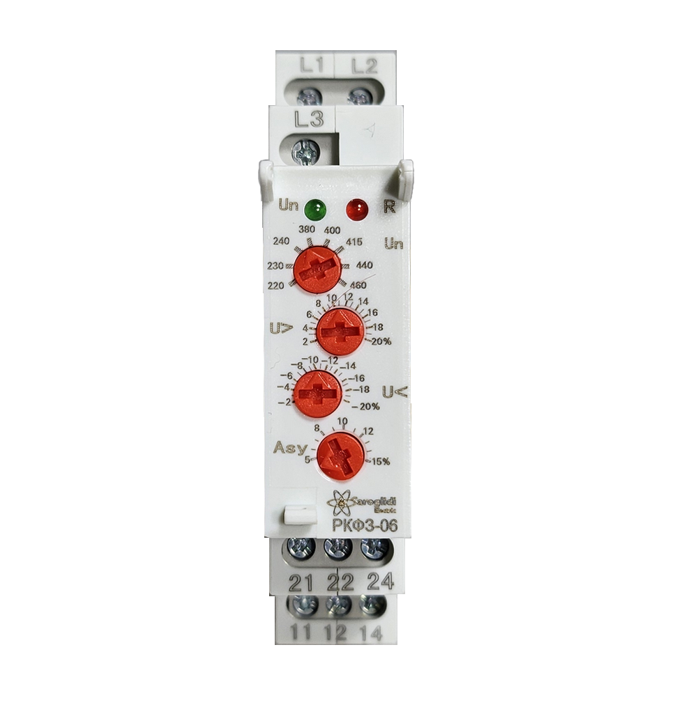 Реле контроля фаз РКФ-3 предназначено для использования в схемах автоматического управления для контроля трёхфазного линейного напряжения в трёхпроводных сетях (без нейтрали). Реле контролирует порядок чередования фаз, обрыв и "слипание" фаз, превышения напряжения выше фиксированного значения, асимметрию фаз.